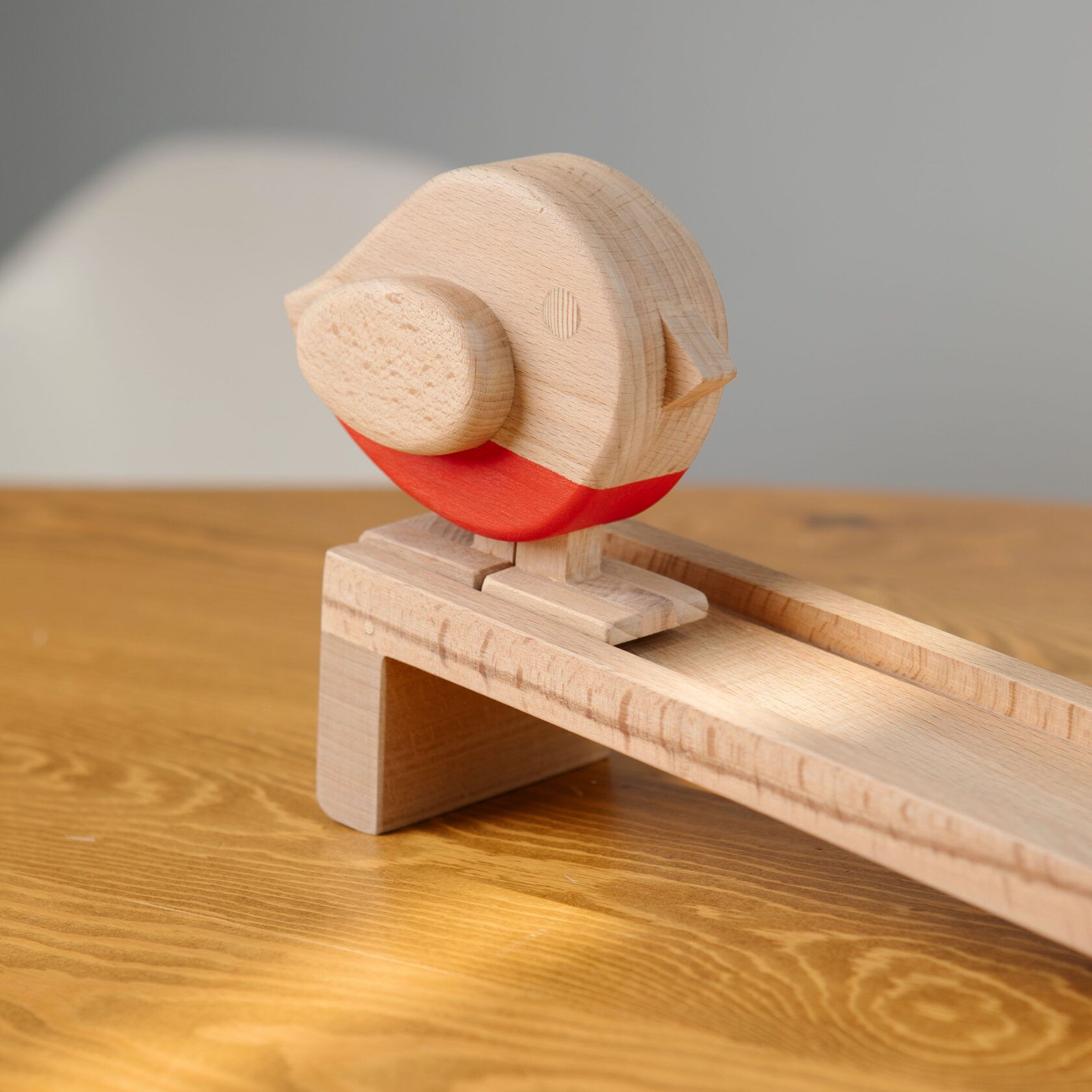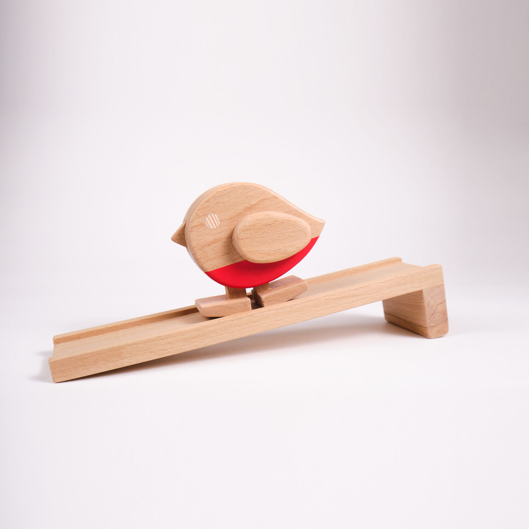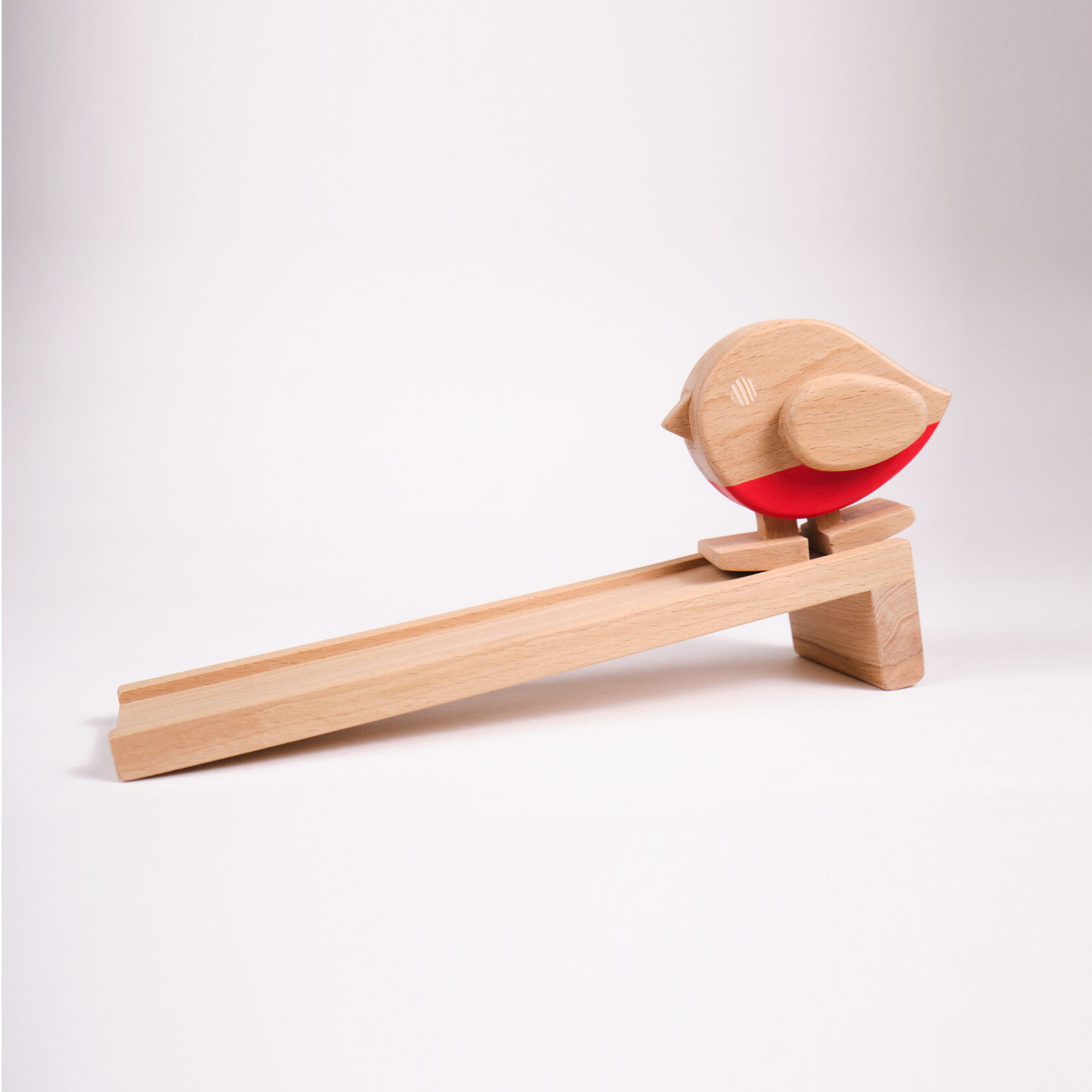 Игрушка шагает за счет инерции. Для этого необходимо поставить птичку на любую поверхность под наклоном и толкнуть вперед. В комплекте мы предусмотрели специальную горку, по которой ходит игрушка. А какой звук когда игрушка в движении! Приятное "цок-цок" от звонкого дерева